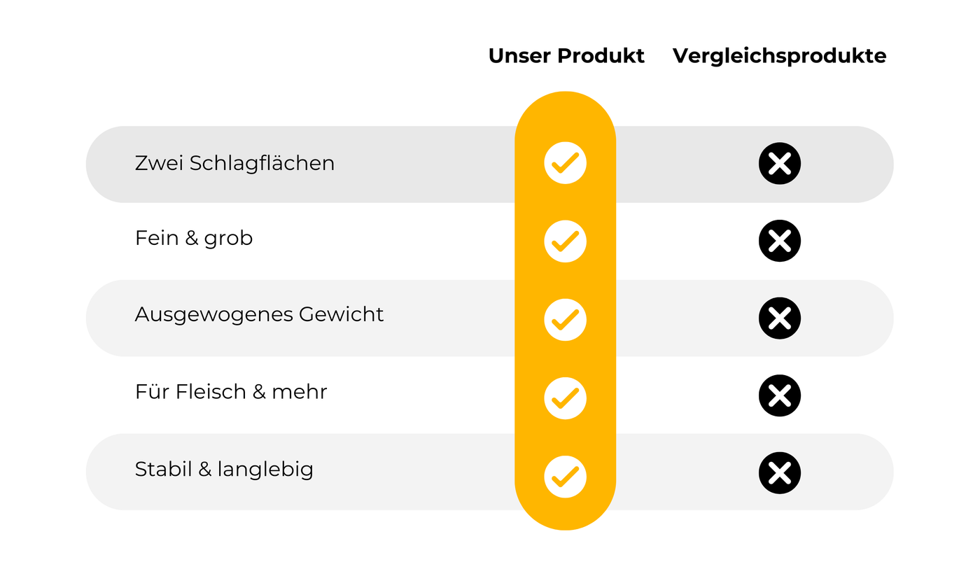 Unsere in Deutschland hergestellten Fleischhammer wurden speziell entwickelt, um das Fleisch schonend zu bearbeiten. Durch ihre einzigartige Konstruktion bewahren sie die Struktur des Fleisches, was zu einem saftigeren und geschmackvolleren Ergebnis führt.